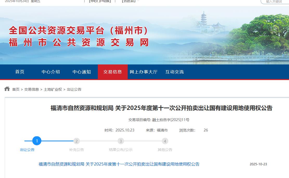 海西房产网(微信公众号:fjhxfcw)消息:2025年10月23日,福清市自然资源和规划局发布“关于2025年度第十一次公开拍卖出让国有建设用地使用权公告”。