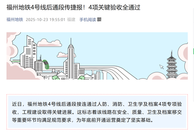 4项关键验收的顺利通过是4号线后通段工程建设的重要里程碑,福州地铁将以此为契机继续推进后续专项验收与安全评估工作全力以赴保障4号线后通段如期开通、安全运营,为福州市民提供更加便捷、可靠的出行服务。