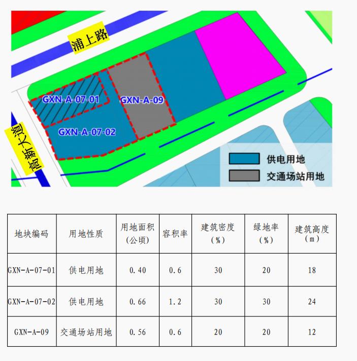 其中GXN-A-07-01和02为供电用地;A-09为交通场站用地,占地约0.56公顷,容积率0.6,建筑密度20%,绿地率20%,建筑限高12米。