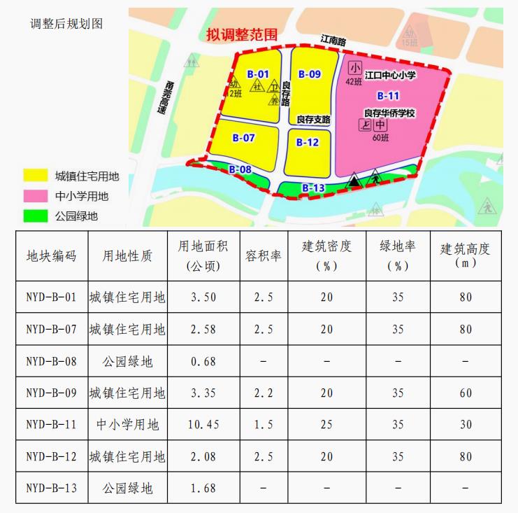 NYD-B-011为中小学用地,总占地10.45公顷,对应的为江口中心小学和良存华侨学校。