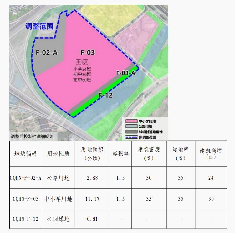 调整之后,公路用地28868平米,中小学用地111611平米(折合167.4165亩),公园用地8064平米。