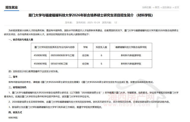 海西房产网(微信公众号:fjhxfcw)消息:10月24日,厦门大学与福建福耀科技大学发布“2026年联合培养硕士研究生项目招生简介 (材料学院)”。