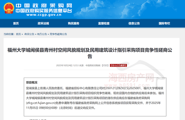 海西房产网(微信公众号:fjhxfcw)消息:10月24日,中国政府采购网发布“福州大学城闽侯县青州村空间风貌规划及民用建筑设计指引采购项目竞争性磋商公告”。