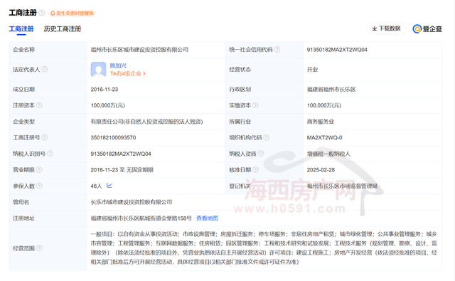 爱企查资料显示,福州市长乐区城市建设投资控股有限公司成立于2016年11月23日,注册地位于福建省福州市长乐区航城街道会堂路158号。