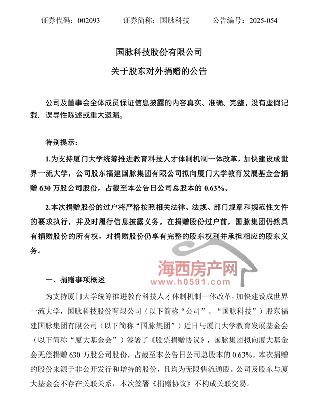 海西房产网(微信公众号:fjhxfcw)消息:10月25日,国脉科技股份有限公司发布“关于股东对外捐赠的公告”。