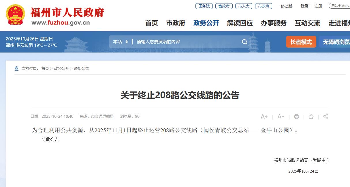 为合理利用公共资源,从2025年11月1日起终止运营208路公交线路(闽侯青岐公交总站——金牛山公园)。 特此公告