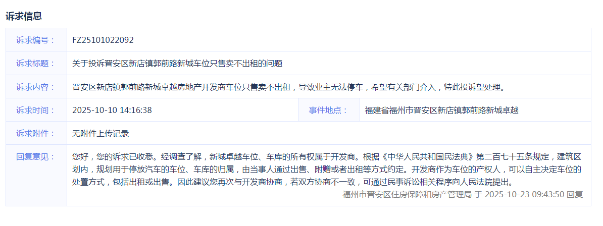 诉求内容:晋安区新店镇郭前路新城卓越房地产开发商车位只售卖不出租,导致业主无法停车,希望有关部门介入,特此投诉望处理