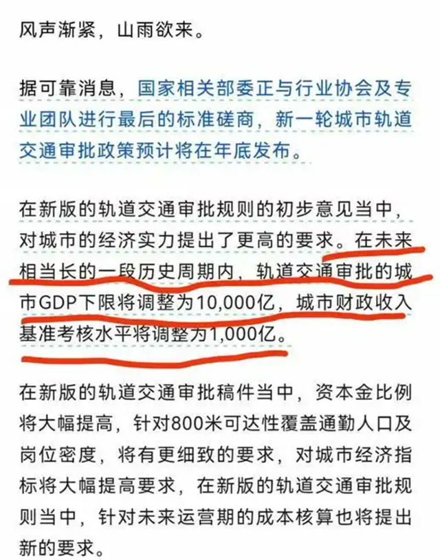 就在近期,浙江自媒体发文爆料称,国家发改委最近收紧了政策,新一轮的地铁申报,要求城市GDP必须破万亿,地方财政收入得超千亿。
