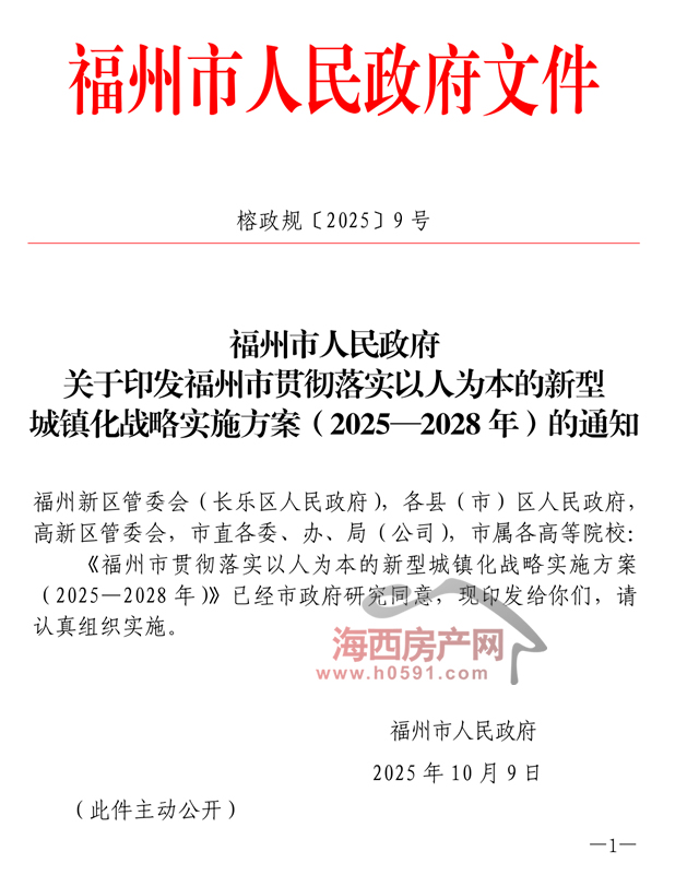 海西房产网(微信公众号:fjhxfcw)消息:10月27日,福州市人民政府下发“关于印发福州市贯彻落实以人为本的新型城镇化战略实施方案(2025—2028年)的通知(榕政规〔2025〕9号)”。