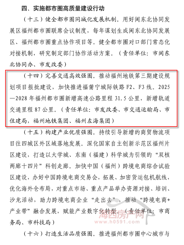 其中,实施都市圈高质量建设行动,完善交通高效强圈。推动福州地铁第三期建设规划项目报批建设,加快推进福莆宁城际铁路F2、F3线。2025—2028年福州都市圈新增高速公路里程31.5公里,新增轨道交通里程87公里。