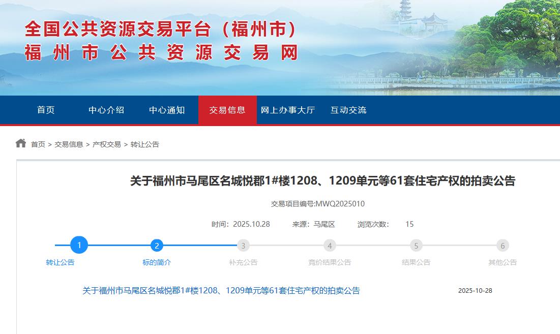 2025年10月28日, 福建省晨至信拍卖行有限公司发布“关于福州市马尾区名城悦郡1#楼1208、1209单元等61套住宅产权的拍卖公告”。