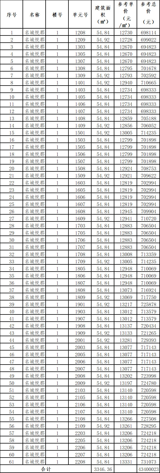 本次拍卖的61套房源,基本是54平方米左右的小户型房源,参考单价从1.27万/平米至1.33万/平米;总建筑面积3346.36平米,参考总价43400023元,平均单价约1.29万/平米
