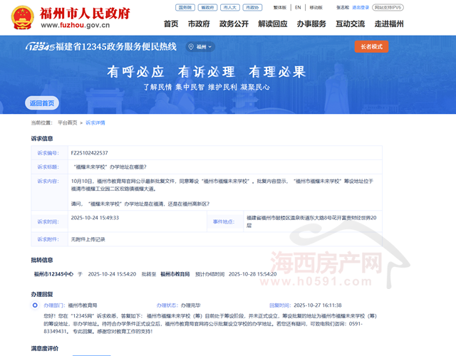 海西房产网(微信公众号:fjhxfcw)消息:近日,有网友通过福建省12345便民服务便民热线平台咨询“福耀未来学校”办学地址?