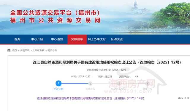海西房产网(微信公众号:fjhxfcw)消息:10月27日,连江县自然资源和规划局发布“关于国有建设用地使用权拍卖出让公告(连地拍卖〔2025〕12号)”。