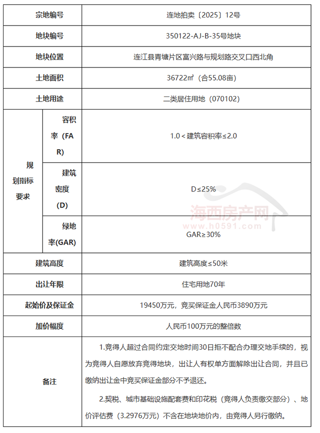 本次拍卖地块编号为连地拍卖〔2025〕12号,位于连江县青塘片区富兴路与规划路交叉口西北角,土地用途为二类居住用地。