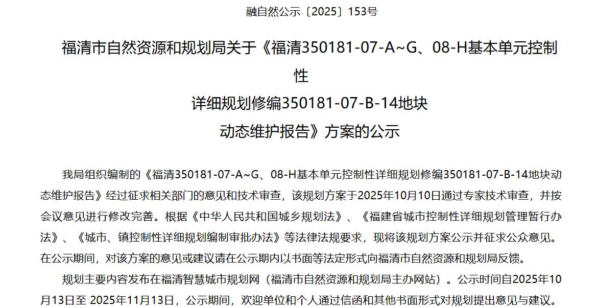 规划主要内容发布在福清智慧城市规划网(福清市自然资源和规划局主办网站)。公示时间自2025年10月13日至 2025年11月13日。