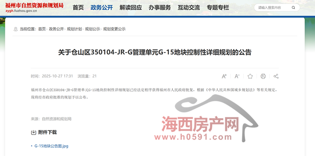 公告透露,福州市仓山区350104-JR-G管理单元G-15地块控制性详细规划已经法定程序获得福州市人民政府批复,根据《中华人民共和国城乡规划法》等有关规定,现将经市政府批准的规划予以公布。