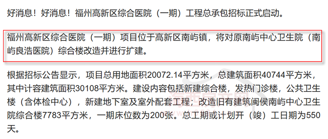 根据此前媒体报道,福州高新区综合医院(一期)项目位于高新区南屿镇,将对原南屿中心卫生院(南屿良浩医院)综合楼改造并进行扩建。