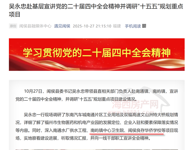 海西房产网(微信公众号:fjhxfcw)消息:据微信公众号“遇见闽侯”发文透露,10月27日,闽侯县委书记吴永忠带领县直相关部门负责人赴南通镇、南屿镇,宣讲党的二十届四中全会精神,并调研“十五五”规划重点项目建设情况。