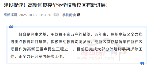 就在10月5日,微信公众号“高新福州”发文透露高新区良存华侨学校新校区建设进展。