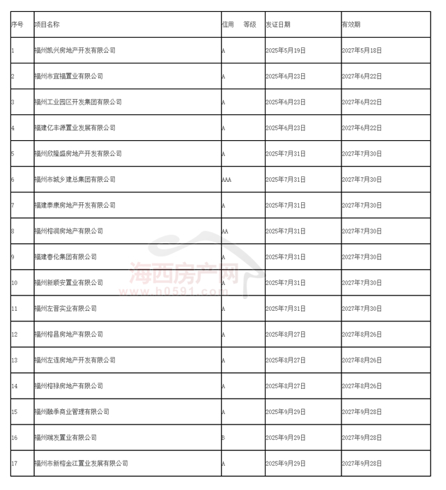 信用评价情况表显示,17家房企当中,AAA级只有福州市城乡建总集团有限公司一家。