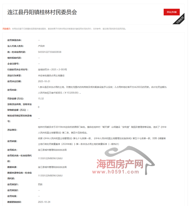 海西房产网(微信公众号:fjhxfcw)消息:10月24日,信用中国(福建福州)发布一则行政处罚信息【连城综罚决﹝2025﹞2-003号】。