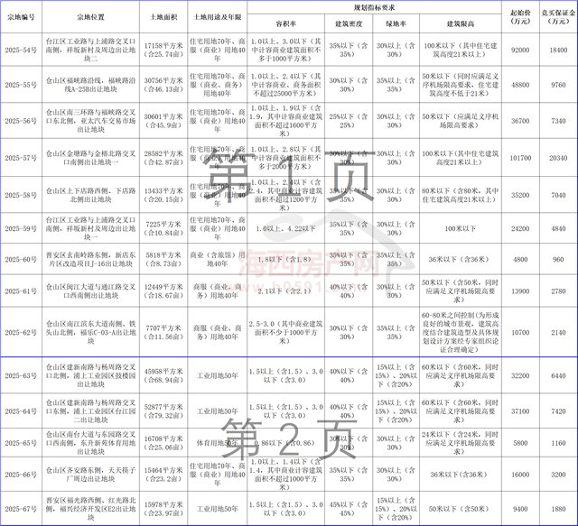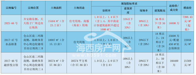 福州宗地2025-66号面积15464平方米(合23.2亩),用途为住宅用地、商服(商业)用地,起拍价16000万元,按容积率上限1.4测算,得出该地块拍卖起始楼面价7390元/㎡。