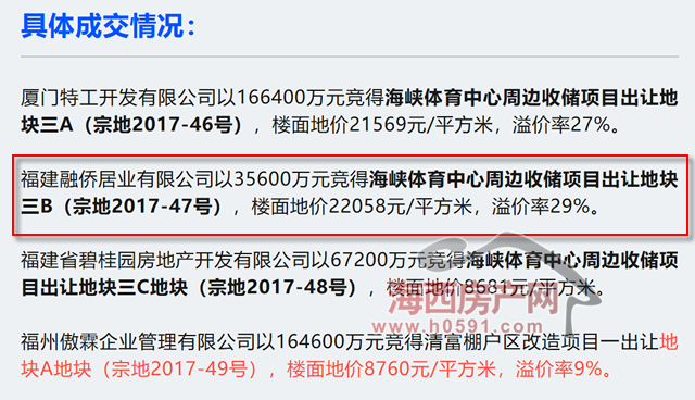 2018年1月11日,福建融侨居业有限公司以35600万+配建450平米社会保障房,成功竞得海峡体育中心周边收储项目出让地块三B(宗地2017-47号),楼面地价22058元/㎡,溢价率29%。