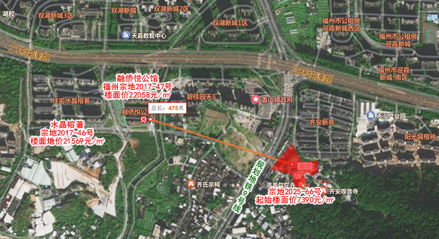 通过百度地图测距,“融侨悦公馆”与11月20日即将拍卖的福州宗地2025-66号直线距离只有475米,该地块如果能够成功出让,大概率也是以底价拍出,也就是楼面价7390.43元/㎡。