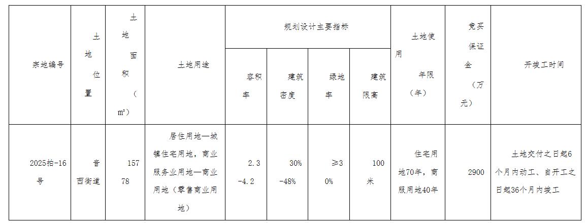 宗地编号 2025拍-16号,位于音西街道;占地面积15778平方米(折合23.667亩);土地用途为:居住用地—城镇住宅用地,商业服务业用地—商业用地(零售商业用地);土地使用年限:住宅用地70年,商服用地40年。