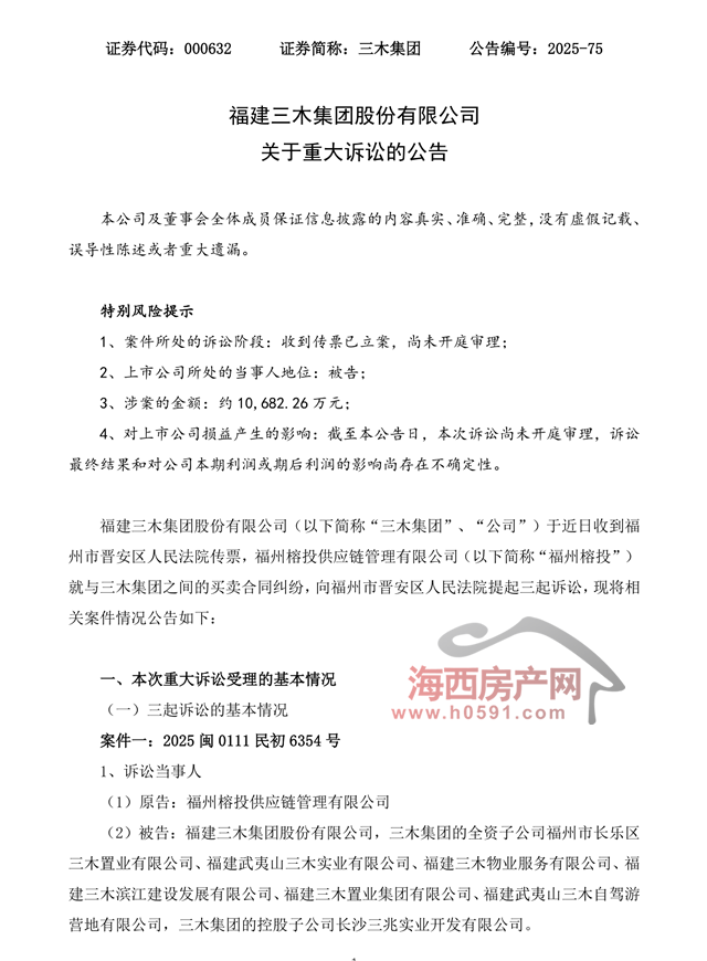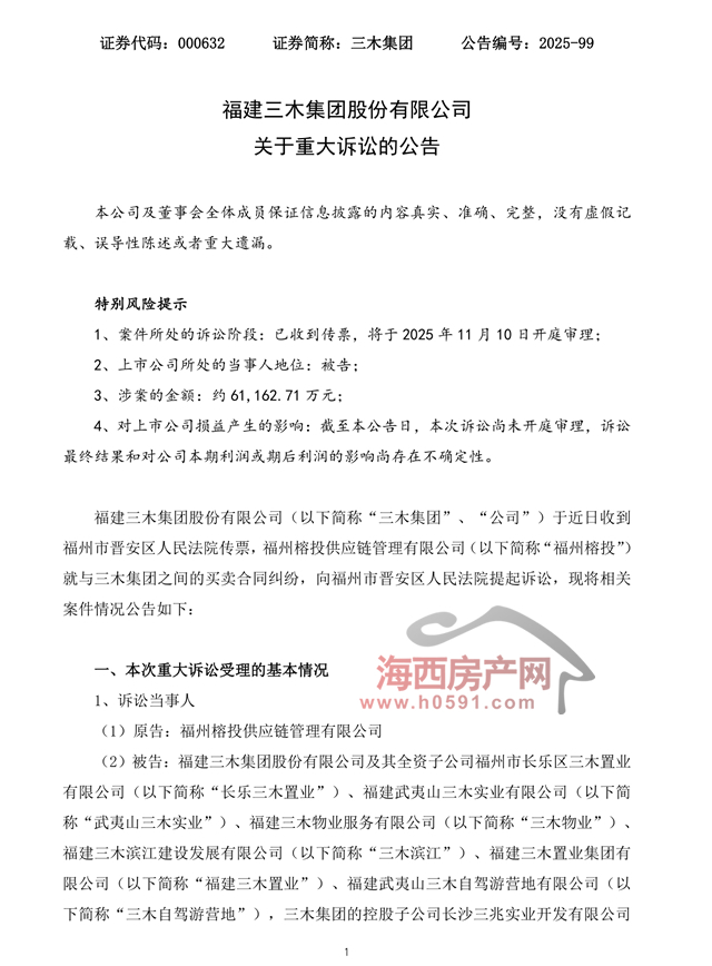海西房产网(微信公众号:fjhxfcw)消息:10月29日,福建三木集团股份有限公司发布“关于重大诉讼的公告”。
