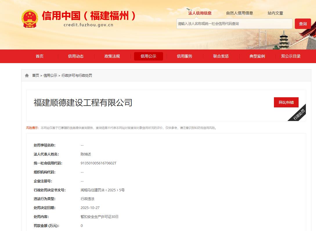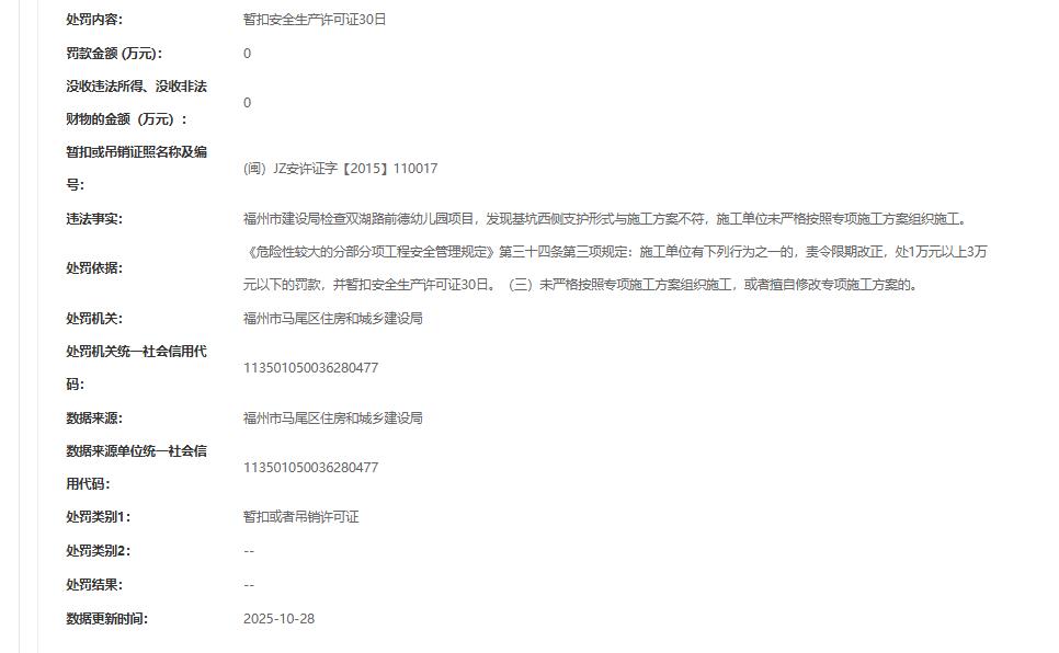 海西房产网(微信公众号:fjhxfcw)消息:2025年10月28日,信用中国(福建福州)发布一则行政处罚,在双湖路前德幼儿园项目,发现基坑西侧支护形式与施工方案不符,施工单位福建顺德建设工程有限公司未严格按照专项施工方案组织施工。