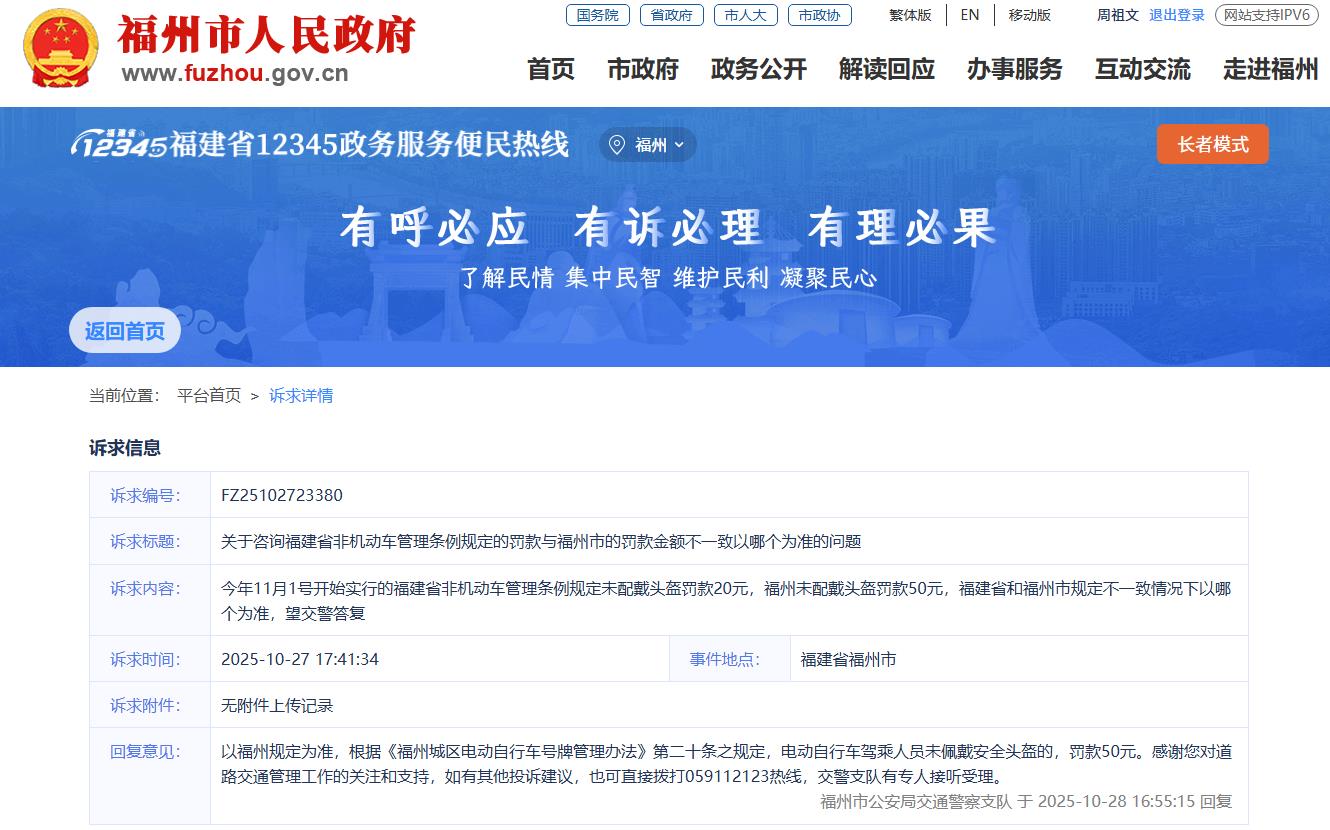 福州市公安局交通警察支队 于 2025-10-28 16:55:15 回复:以福州规定为准,根据《福州城区电动自行车号牌管理办法》第二十条之规定,电动自行车驾乘人员未佩戴安全头盔的,罚款50元。感谢您对道路交通管理工作的关注和支持,如有其他投诉建议,也可直接拨打059112123热线,交警支队有专人接听受理。