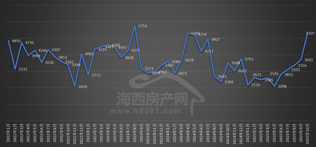 图一为2022年1月-2025年10月福州全市住宅签约变化趋势图。刚刚过去的10月,福州全市住宅签约5307套,环比9月增加1615套,增幅达到43.74%,连续五个月上涨,已经逼近2023年8月的阶段高点。