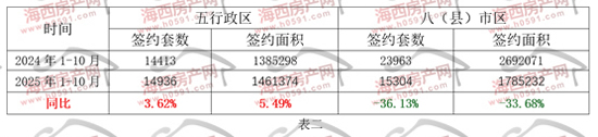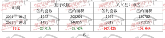 表三为2024年10月和2025年10月福州五行政区+八县(市)区住宅签约明细表。