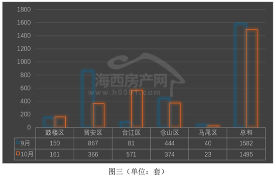 “仓山区”和“晋安区”位列二、三两位,10月分别签约374套和366套,环比9月分别减少70套和501套。