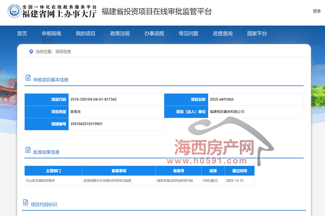 海西房产网(微信公众号:fjhxfcw)消息:福建省投资项目在线审批监管平台公布信息显示,福州宗地2025-44号地块已于10月31日通过备案报建,距离该地块拍卖仅9天。