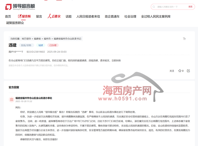 该投诉于2025年10月20日得到福州市仓山区金山街道办事处回复: