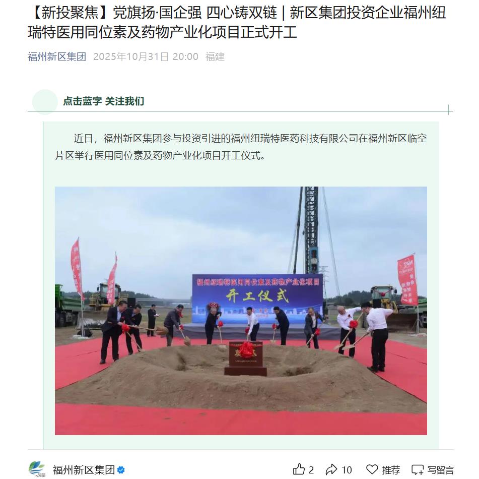 项目建成后将成为纽瑞特布局东南市场医用同位素及药品的生产基地,有利于完善区域核医学产业链,推动前沿核医学技术的临床应用,为福州新区集团生物医药产业链的强链补链、区域生物医药产业高质量发展增添新的核心引擎。