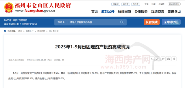海西房产网(微信公众号:fjhxfcw)消息:近日,仓山区统计局对外公布2025年1-9月份固定资产投资完成情况。