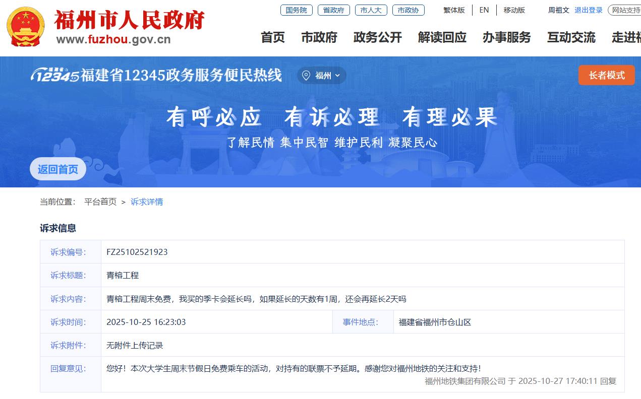 福州地铁集团有限公司 于 2025-10-27 17:40:11 回复您好!本次大学生周末节假日免费乘车的活动,对持有的联票不予延期。感谢您对福州地铁的关注和支持!