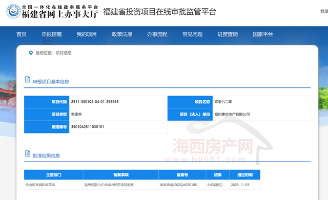 海西房产网(微信公众号:fjhxfcw)消息:福建省投资项目在线审批监管平台公布信息显示,位于金山核心区的“宸玺台二期”已于11月4日通过备案报建,距离拿地近13天。