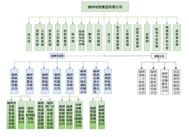 集团下设16个部室以及1个运营事业部(分公司),下属8个全资子公司(福州地铁置业有限公司、福州地铁实业有限公司、福州地铁维保有限公司、福州地铁六号线东调段有限公司、福州地铁建设有限公司、福州地铁传媒有限公司、福州轨道交通设计院有限公司、福州地铁科技有限公司),4个参股公司(福州交通信息投资运营有限公司、福州华榕运输服务有限公司、福州地铁二号线东延线有限公司、北京城建智控科技股份有限公司)。截至2024年底,总资产1291.16亿元,员工总数约8050人。