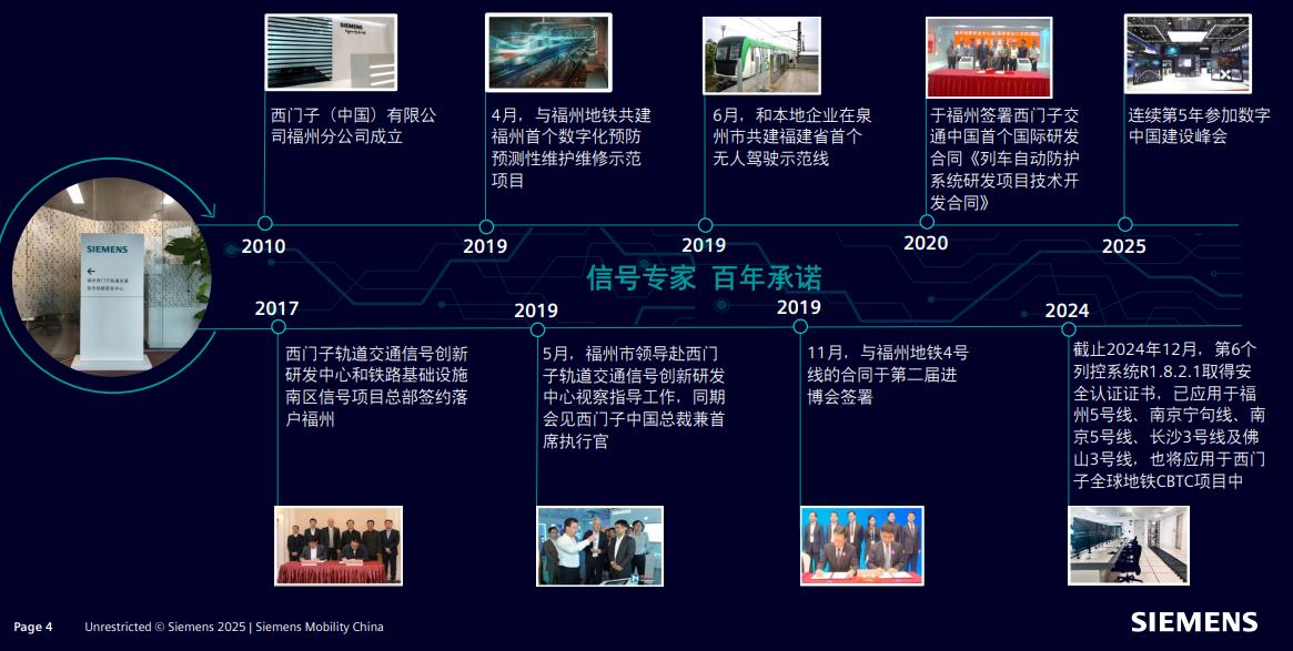 据悉,西门子与福州地铁合作由来已久,2010年,西门子(中国)有限公司福州分公司成立。2019年4月,与福州地铁共建福州首个数字化预防预测性维护维修示范项目。2017年,西门子轨道交通信号创新研发中心和铁路基础设施南区信号项目总部签约落户福州。截止2024年12月,第6个列控系统R1.8.2.1取得安全认证证书,已应用于福州5号线、南京宁句线、南京5号线、长沙3号线及佛山3号线,也将应用于西门子全球地铁CBTC项目中。