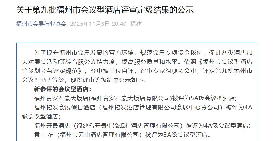 海西房产网(微信公众号:fjhxfcw)消息:2025年11月3日,福州市会展行业协会发布“关于第九批福州市会议型酒店评审定级结果的公示”。