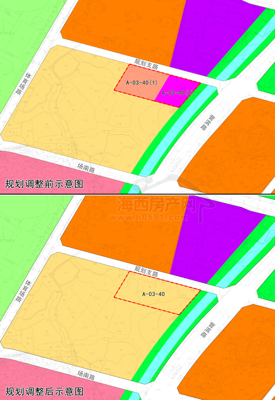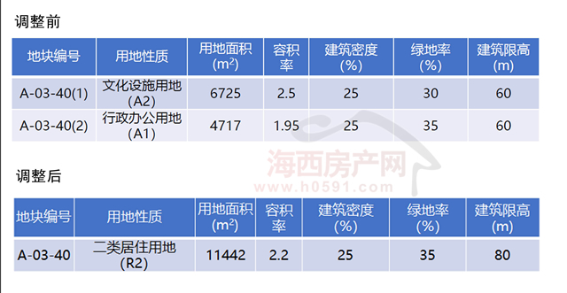 将A-03-40(1)、A-03-40(2)地块合并,合并后的用地性质调整为二类居住用地(R2),用地面积为11442平方米,设定容积率为≤2.2,建筑密度为≤25%,绿地率为≥35%,建筑限高为80m。