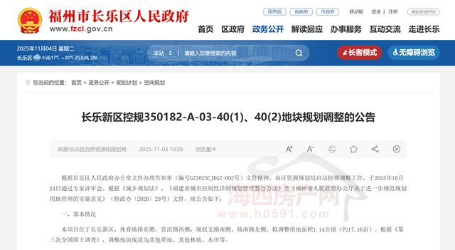海西房产网(微信公众号:fjhxfcw)消息:11月3日,福州市长乐区自然资源和规划局发布“长乐新区控规350182-A-03-40(1)、40(2)地块规划调整的公告”。