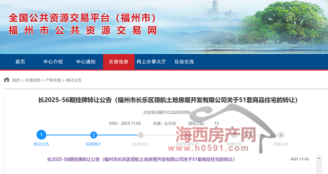 海西房产网(微信公众号:fjhxfcw)消息:11月5日,福州市公共资源交易网发布“长2025-56期挂牌转让公告”。