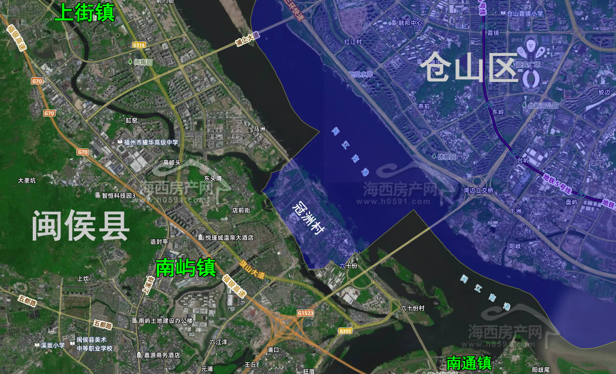 冠洲村与仓山区主体隔着乌龙江,位于在浦上大桥与湾边大桥之间,与上街镇马排村交界,下与南屿镇六十份村交界。