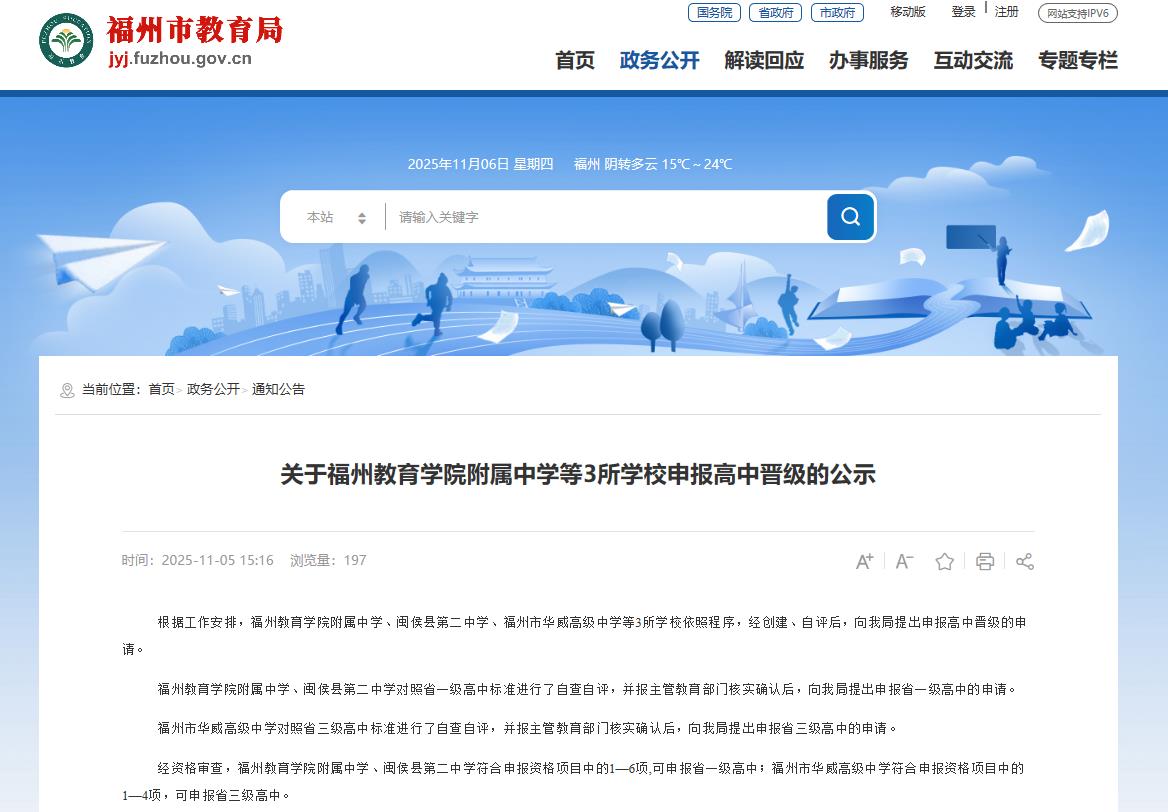 海西房产网(微信公众号:fjhxfcw)消息:2025年11月5日,福州市教育局发布“关于福州教育学院附属中学等3所学校申报高中晋级的公示”。